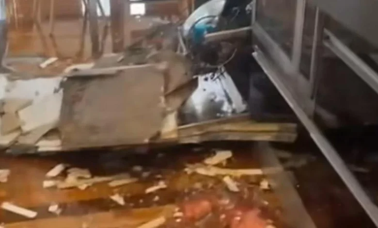- Video showed water on the floor after the stove rangehood, roof slats and ventilation crashed through the ceiling.