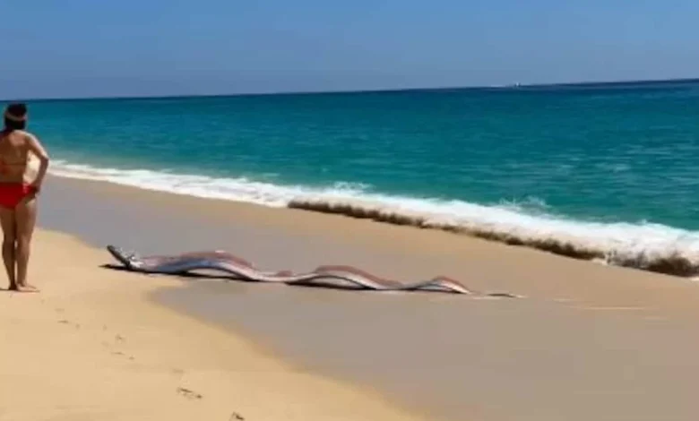 The rare appearance of two giant poisson ruban beached in Cabo San Lucas has become a sudden focal point for tourists and residents who witnessed an extraordinary encounter on a local shore. Two long, ribbon-shaped marine creatures were seen near the surf, one struggling in shallow water and another close to the shoreline; beachgoers entered the water to nudge at least one of the animals back toward deeper water. The combination of a live rescue effort and the simultaneous presence of a second specimen makes this moment notable because these animals normally live at depths near 3, 000 feet and are rarely observed alive at the surface.