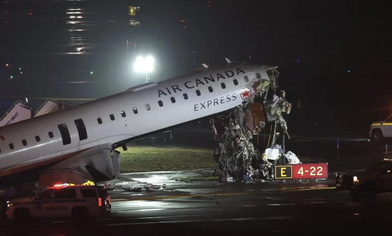 The aircraft, a CRJ-900 operated by Jazz Aviation for Air Canada Express, struck a Port Authority vehicle that was responding to a separate incident on the runway during landing. Emergency crews rushed victims to nearby hospitals; in total 41 people were transported to medical facilities, with 32 later released and nine still hospitalized, including the two people who had been in the fire-rescue vehicle, described as in stable condition. Images circulating from the scene show the forward fuselage and cockpit area severely damaged and numerous emergency vehicles clustered on the runway.