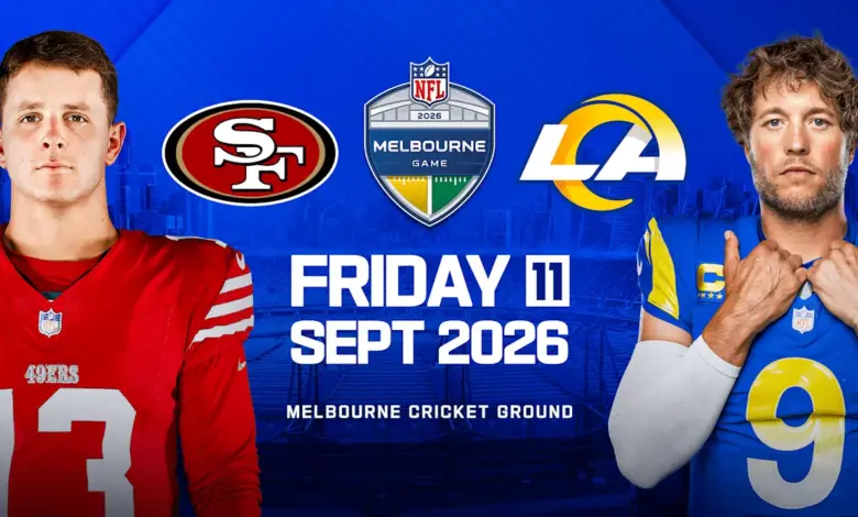 The matchup is San Francisco 49ers at Los Angeles Rams at the Melbourne Cricket Ground, with kickoff set for 8: 35 p. m. ET on the NFL calendar. The trip requires a roughly 19- to 20-hour flight for the visiting team, and the 49ers will not receive a bye week after the contest. League scheduling places the game among an international slate totaling nine matches, with the 49ers assigned two of those international appearances this season, including a later game in Mexico City.