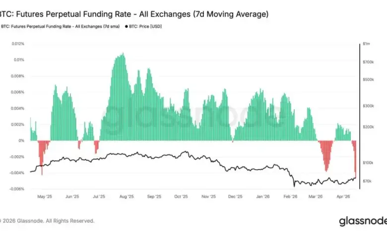 Separate market data showed funding rates had already turned deeply negative, reaching their most negative levels since 2023 on a seven-day moving average of around -0. 005%. Funding rates are payments between long and short traders in perpetual futures contracts, and negative readings mean shorts are paying longs. That typically reflects a market tilted toward downside bets.